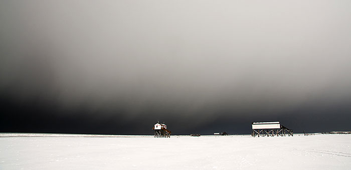 Pfahlbauten vor St.Peter - Ording, 3. Februar 2010 um 10:29 Uhr.