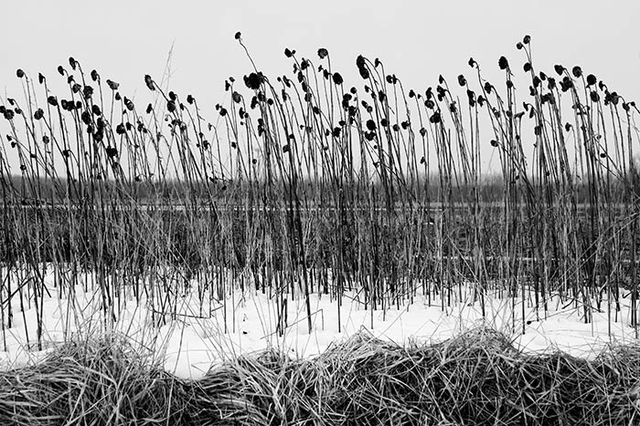 Kleines Sonnenblumenfeld im Schnee, Katinger Watt, 28. Februar 2010 um 12:03 Uhr.