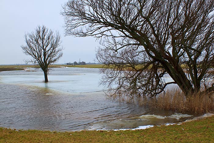 Vom Schmelzwasser überflutete Weide, Rethdeich, 28. Februar 2010 um 12:23 Uhr.