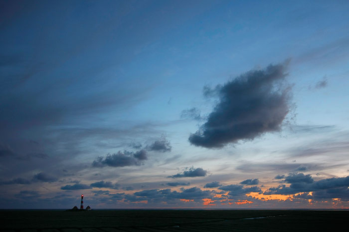 Leuchtturm Westerhever vom Deich bei Leikenhusen, 11. August 2010 um 21:40 Uhr.