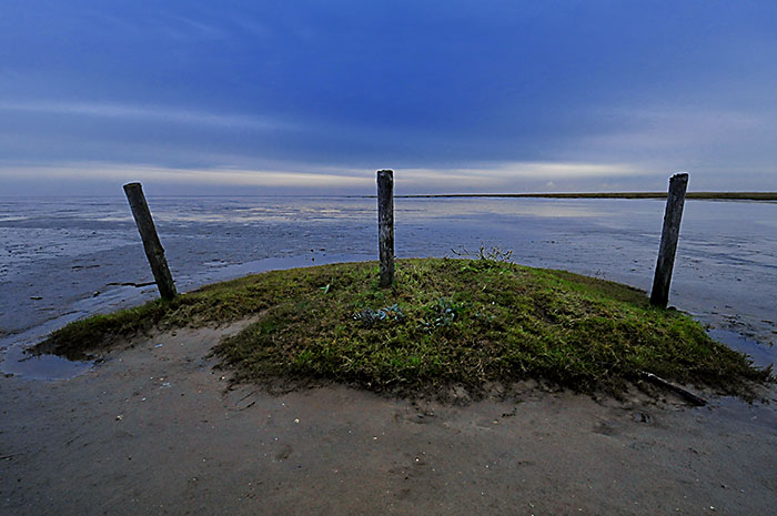 Drei Holzpfähle als Parkplatzbegrenzung in St.Peter-Böhl, 26. Oktober 2010 um 17:36 Uhr.