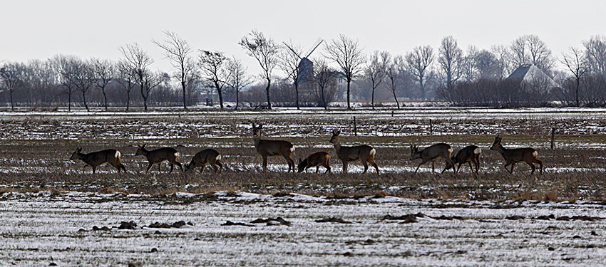 Rehe auf einem Feld in der Nähe der Windmühle "Catharina" bei Witzwort 21. Februar 2011 um 13:09 Uhr
