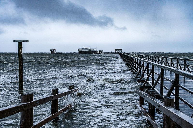 Auf der Seebrücke bei Sturmflut, St.Peter-Ording. Dienstag, 11. Februar 2020 um 14:17 Uhr. Foto © Copyright by Holger Tange