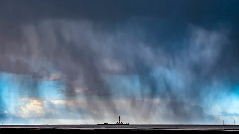 "Schneeschauer über dem Leuchtturm Westerhever, Blick von Tümlauerkoog" Sonnabend, 25. Februar 2023 um 15:38 Uhr. Foto © Copyright by JP Schneider