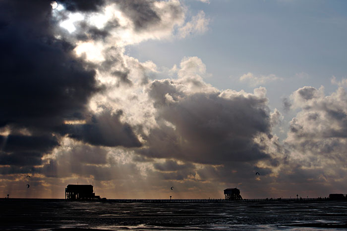 Dramatische Wolken über dem Ordinger Strand. Links im Bild der Pfahlbau "Silbermöwe" 19. Juni 2011 um 20:11 Uhr