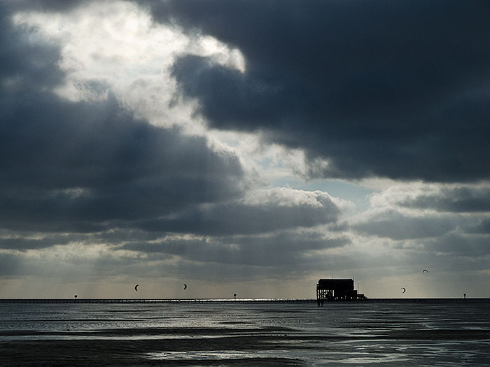 Wolken über dem Ordinger Strand. Pfahlbau-Gaststätte "Silbermöwe". 15. Juli 2011 um 19:47 Uhr