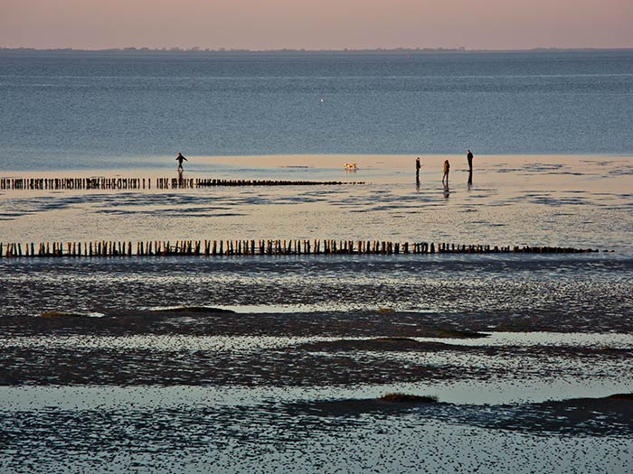 Weiches Abendlicht. Vier Menschen im Watt & ein Hund. Deichvorland zwischen Stufhusen und Schanze. 15. Oktober 2011 um 18:07 Uhr