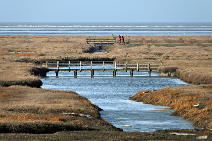 Zwei Spaziergänger auf dem Weg zum Leuchtturm Westerhever. Rosenmontag, 20. Februar 2012 um 11:11 Uhr