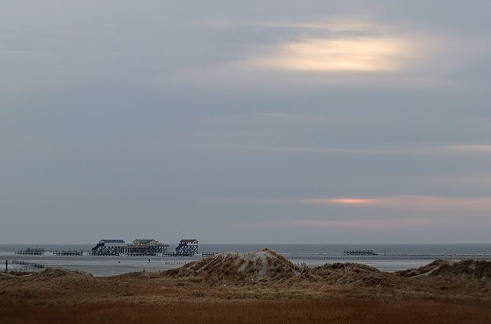 Ordinger Pfahlbauten. Blick von der Deichüberfahrt. Montag, 20. Februar 2012 um 17:10 Uhr