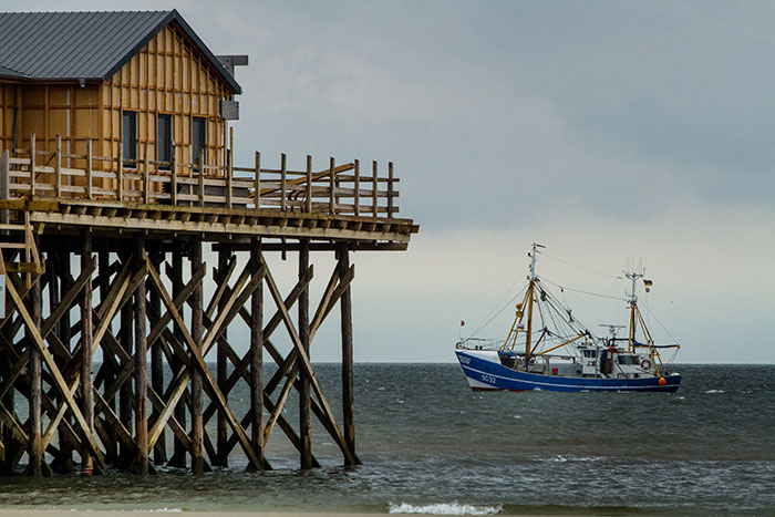 Pfahlbau "Strandbar 54° Nord" (während der Renovierung), Krabbenkutter auf Fangfahrt Sonntag, 8. Juli 2012 um 18:50 Uhr