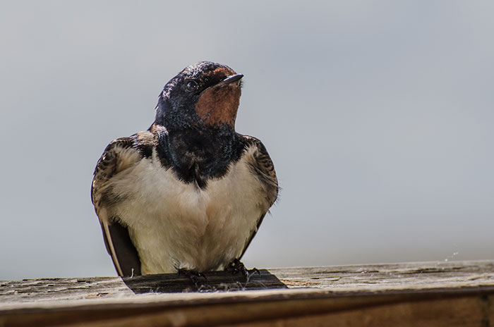 Eine Rauchschwalbe sitzt in der Sichtklappe einer Vogelbeobachtungshütte im Katinger Watt. Sonntag, 15. Juli 2012 um 11:37 Uhr