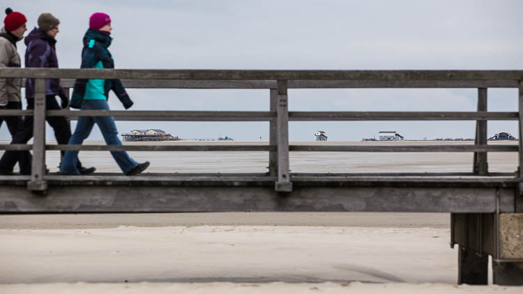 Pfahlbaugruppe "Strandbar 54° Grad Nord" vor St. Peter-Ording / Blick durch die alte Seebrücke. Mittwoch, 20. Februar 2013 um 15:03 Uhr