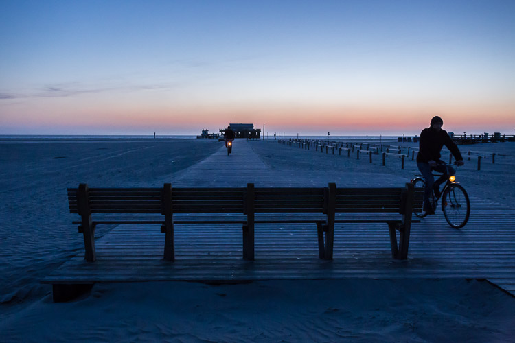 Fahrradtour in der blauen Stunde. Im Hintergrund Pfahlbau "Strandbar 54° Nord" / St.Peter-Ording. Dienstag, 30. April 2013 um 21:24 Uhr
