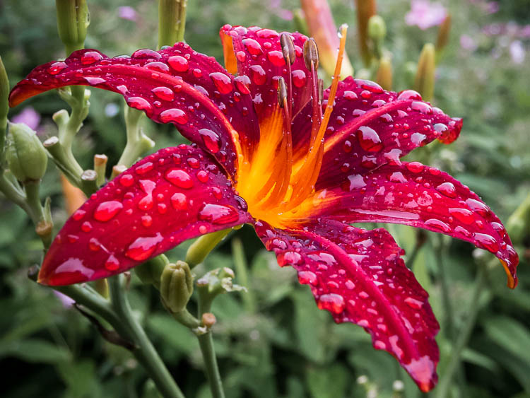 Was für ein Glitzern! Wassertropfen auf einer Taglilienblüte nach einem Sommerschauer. Café Alte Schule Warmhörn. Sonntag, 18. August 2013 um 13:45 Uhr