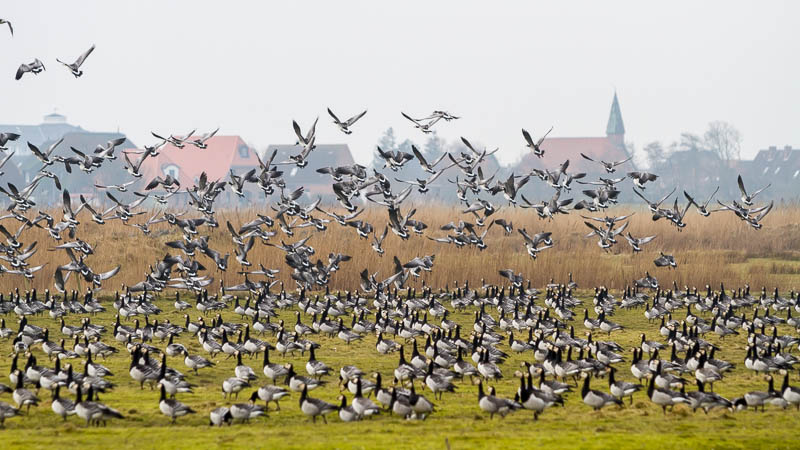 Nonnengänse. Im Hintergrund die Ordinger St. Nikolai Kirche. Donnerstag, 20. Februar 2014 um 11:36 Uhr