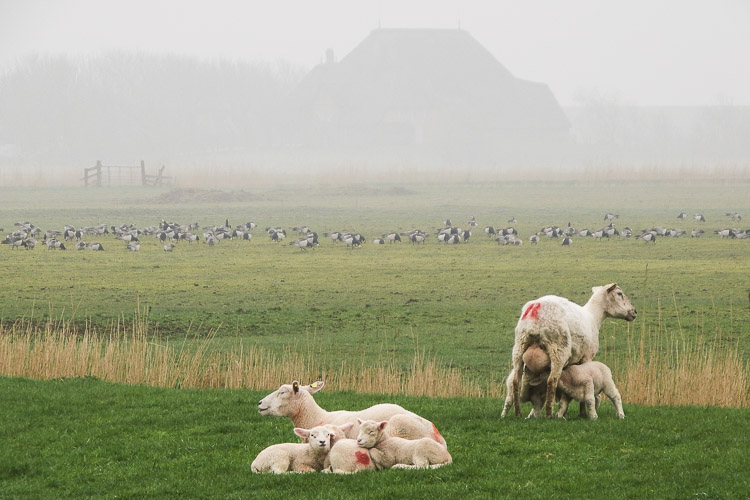 Nebelstimmung in Westerhever. Die Lämmer bleiben in der Nähe ihrer Mütter. Im Hintergrund Nonnengänse. Sonnabend, 5. April 2014 um 16:23 Uhr