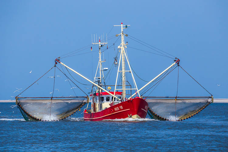 Der Krabbenkutter HUS 18 im Einsatz vor Norderoogsand. Mittwoch, 4. Juni 2014 um 11:12 Uhr