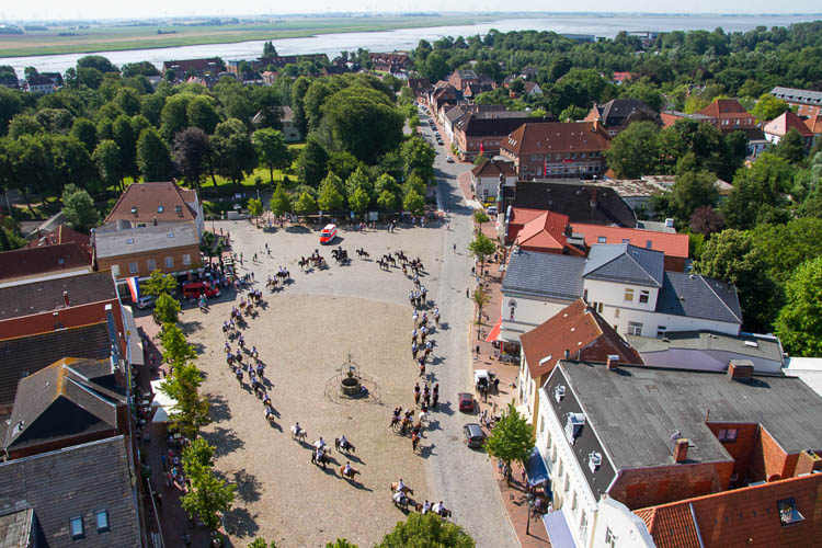 Blick vom Kirchturm auf den Tönninger Marktplatz. Sonnabend, 19. Juli 2014 um 10:43 Uhr