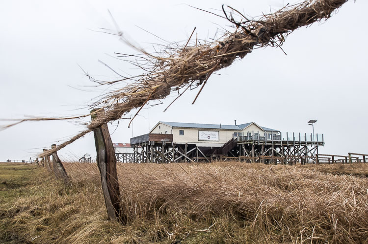 Spuren des letzten Hochwassers im Weidezaun. Pfahlbau "Strandhütte", St.Peter-Ording / Südstrand. Freitag, 20. Februar 2015 um 12:43 Uhr
