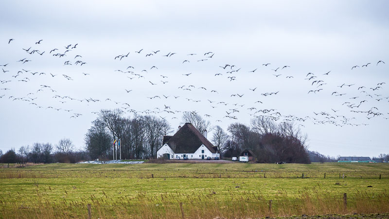 Nonnengänse über dem Restaurant-Café "Roter Haubarg" bei Witzwort. Dienstag, 24. Februar 2015 um 14:36 Uhr
