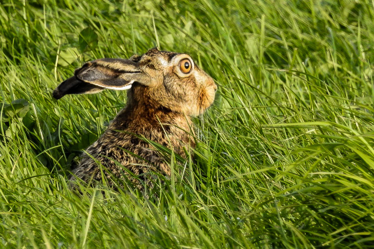 Hase im hohen Gras. Abendsonne in der Nähe von Osterhever. Sonntag, 10. Mai 2015 um 19:50 Uhr