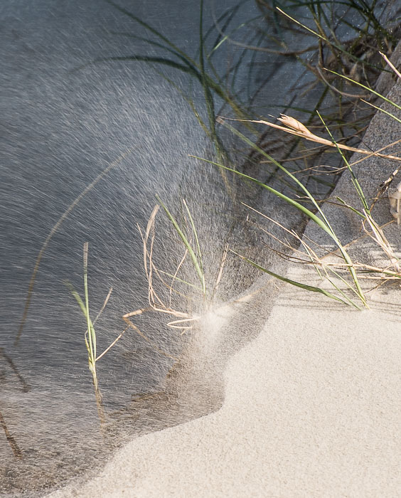 Scharfer Wind bläst über den Strand. Sandwirbel an einer Dünenkante. Dienstag, 12. Mai 2015 um 19:06 Uhr
