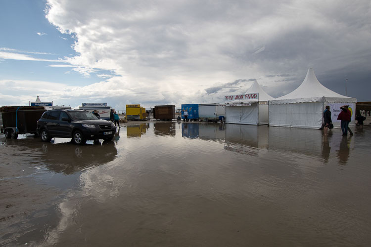 "Landunter". Das Beachvolleyball Gelände am Strand von SPO nach einer stürmischen halben Stunde. Sonnabend, 25. Juli 2015 um 15:33 Uhr