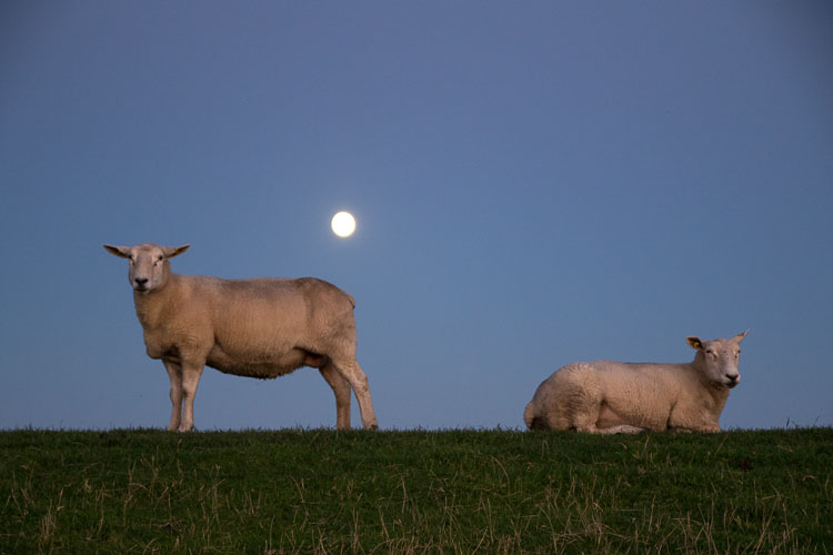 Schafe bei Vollmond auf der Deichkrone / Tümlauer Koog. Sonnabend, 26. September 2015 um 19:41 Uhr