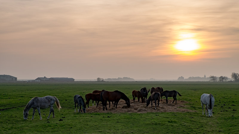 Pferde auf einer Fenne. Im Hintergrund der Kirchturm von Westerhever. Sonnabend, 31. Oktober 2015 um 16:17 Uhr