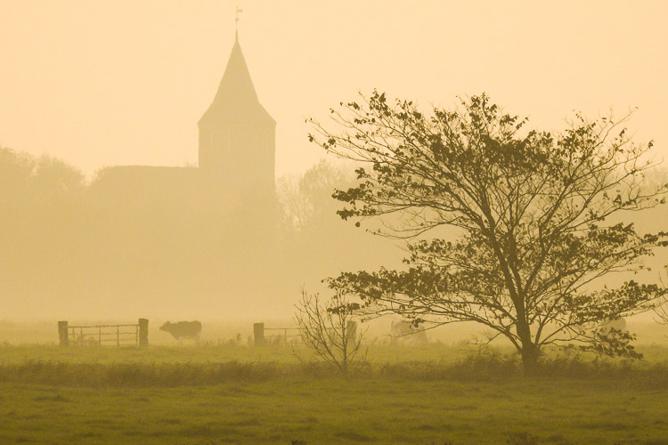 Nebelstimmung im Gegenlicht. Die Silhouette der St.Stephanus-Kirche von Westerhever. Sonnabend, 31. Oktober 2015 um 16:23 Uhr