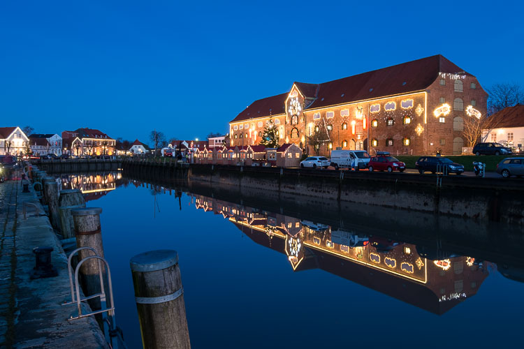 Blaue Stunde und Windstille. Das weihnachtlich dekorierte Packhaus am Hafen von Tönning. Sonntag, 13. Dezember 2015 um 16:43 Uhr
