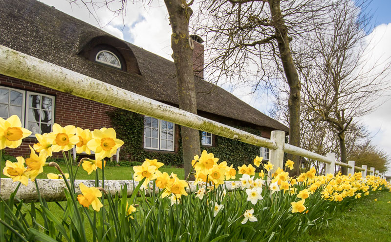 "Reetdachidylle" - Osterglocken in voller Blüte / Utholm. Dienstag, 19. April 2016 um 16:29 Uhr