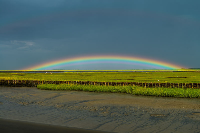 Regenboegen über den Salzwiesen am Tümlauer Hafen. Sonntag, 28. August 2016 um 16:20 Uhr
