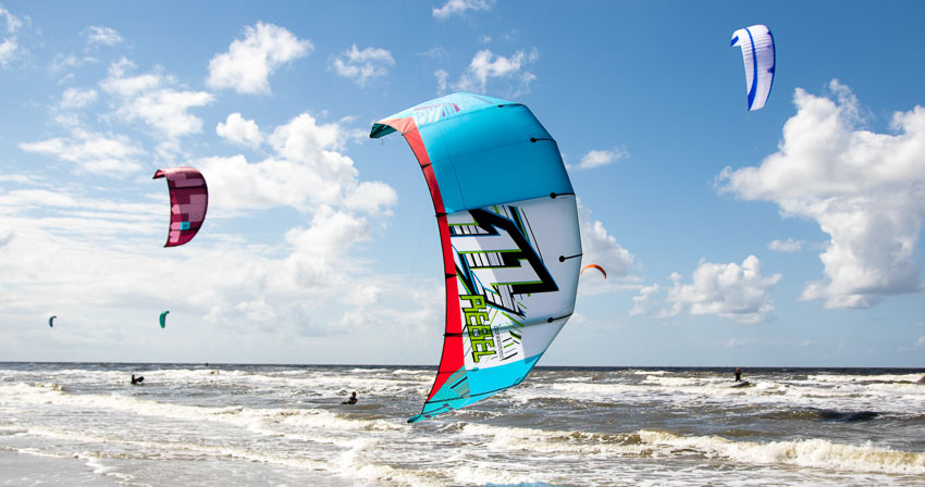 Kitesurfer am Ordinger Strand. Sonntag, 13. August 2017 um 13:22 Uhr