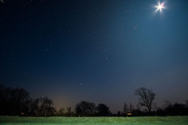 Der Mond und ein sternenklarer Himmel über Poppenbüll. Das Ganze bei minus 3° Celsius. Donnerstag, 22. Februar 2018 um 19:13 Uhr