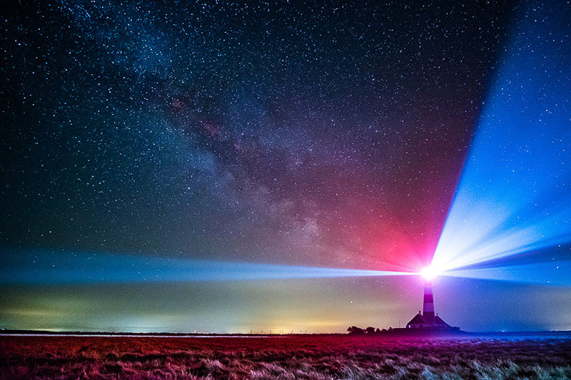 Leuchtturm Westerhever mit Sternenhimmel und Milchstraße. Donnerstag, 19. April 2018 um 3:27 Uhr