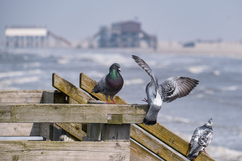 Tauben an der Strandbar 54° Nord. Im Hintergrund der Pfahlbau Café Silbermöwe. Freitag, 5. April 2019 um 13:21 Uhr.
