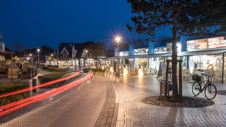 Blaue Stunde. Die Straße "Im Bad", St.Peter-Ording. Freitag, 5. April 2019 um 20:45 Uhr.