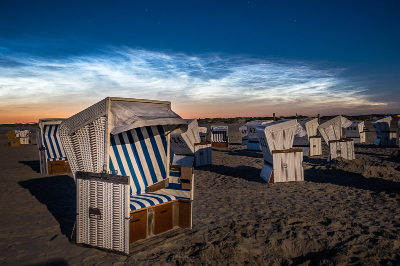 Leuchtende Nachtwolken über dem Strand von St.Peter-Ording. Bei Vollmond mitten in der Nacht ! Montag, 17. Juni 2019 um 2:18 Uhr.