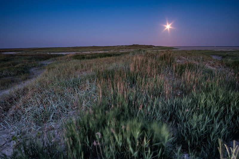 Vollmond über dem Deichvorland an der Seebrücke von St.Peter-Ording. Montag, 17. Juni 2019 um 3:40 Uhr.