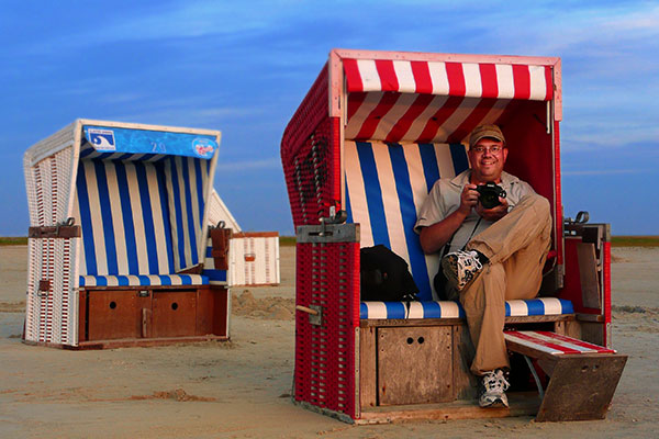 Selbstporträt im roten Lieblingsstrandkorb No.1 in St.Peter-Böhl / Foto © Copyright by J-P Schneider