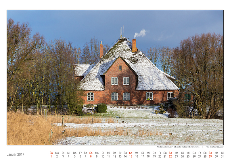 Januar 2017: Der Schornstein raucht. Eiderstedter Haubarg in der Wintersonne / Foto von JP Schneider.