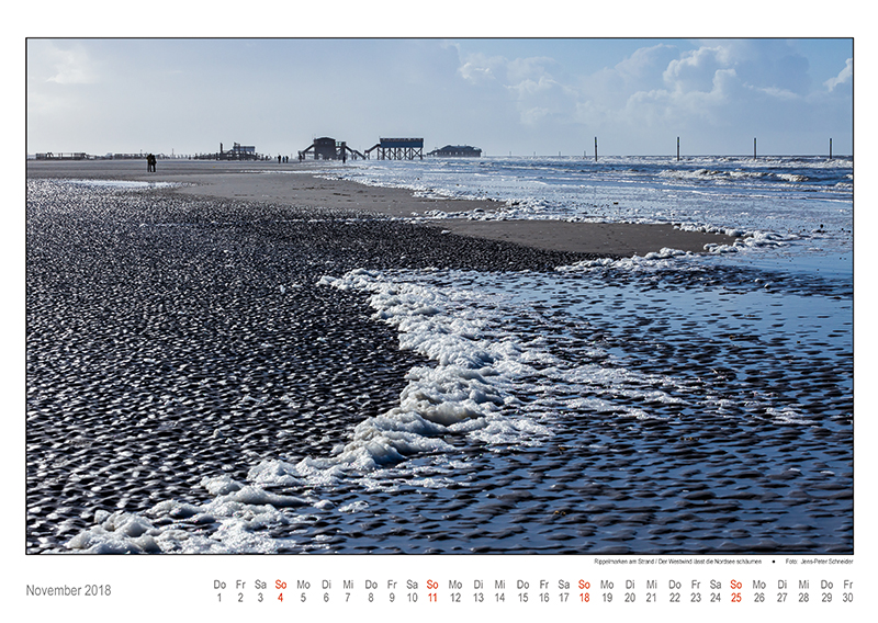 November 2018: Rippelmarken am Strand / Der Westwind lässt die Nordsee schäumen. / Foto von JP Schneider.