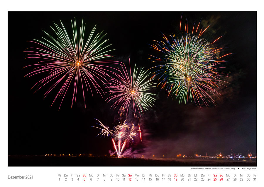Dezember 2021: Silvesterfeuerwerk über der "Seebrücke" von St.Peter-Ording. / Foto von Holger Tange.