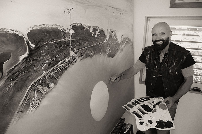 Hier arbeitet er an dem SPO-Super-Panorama-Ölbild. 220cm x 600cm auf drei