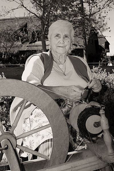Marie Törper an ihrem Spinnrad anlässlich einer Vorführung im Kohstall Poppenbüll. Marie Törper feierte 2010 ihren 80. Geburtstag.