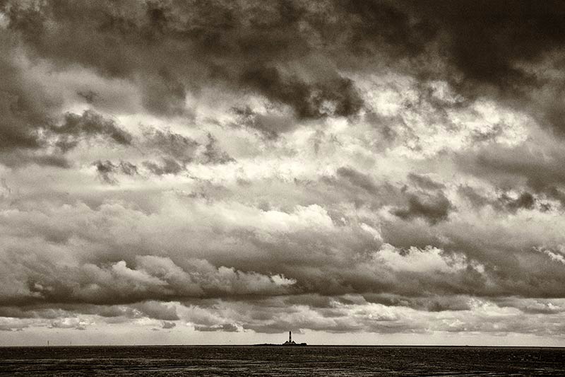 Dramatische Wolkenstimmung über dem Leuchtturm Westerhever 2011 / Foto